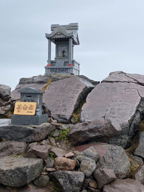 朝起きると遠くの山が見えたのもつかの間、すっかりガスの中。そして予報に反して雨が・・・稜線は15m~20mの風との事で、現地ガイドさんのパーティーはそのまま下山との事。私たちは温泉神社と源泉地を訪ねてから下山することにして小屋をスタート。温泉神社に参拝。