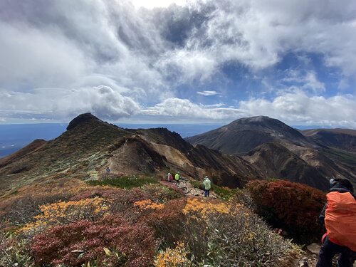RWからはガスで視界が無かったのですが、しばらくするとガスが薄くなりました。山肌は、パッチワークのように緑の笹に赤やオレンジ色がきれいです。思っていたより風も弱く、雨も本降りになることはありませんでした。