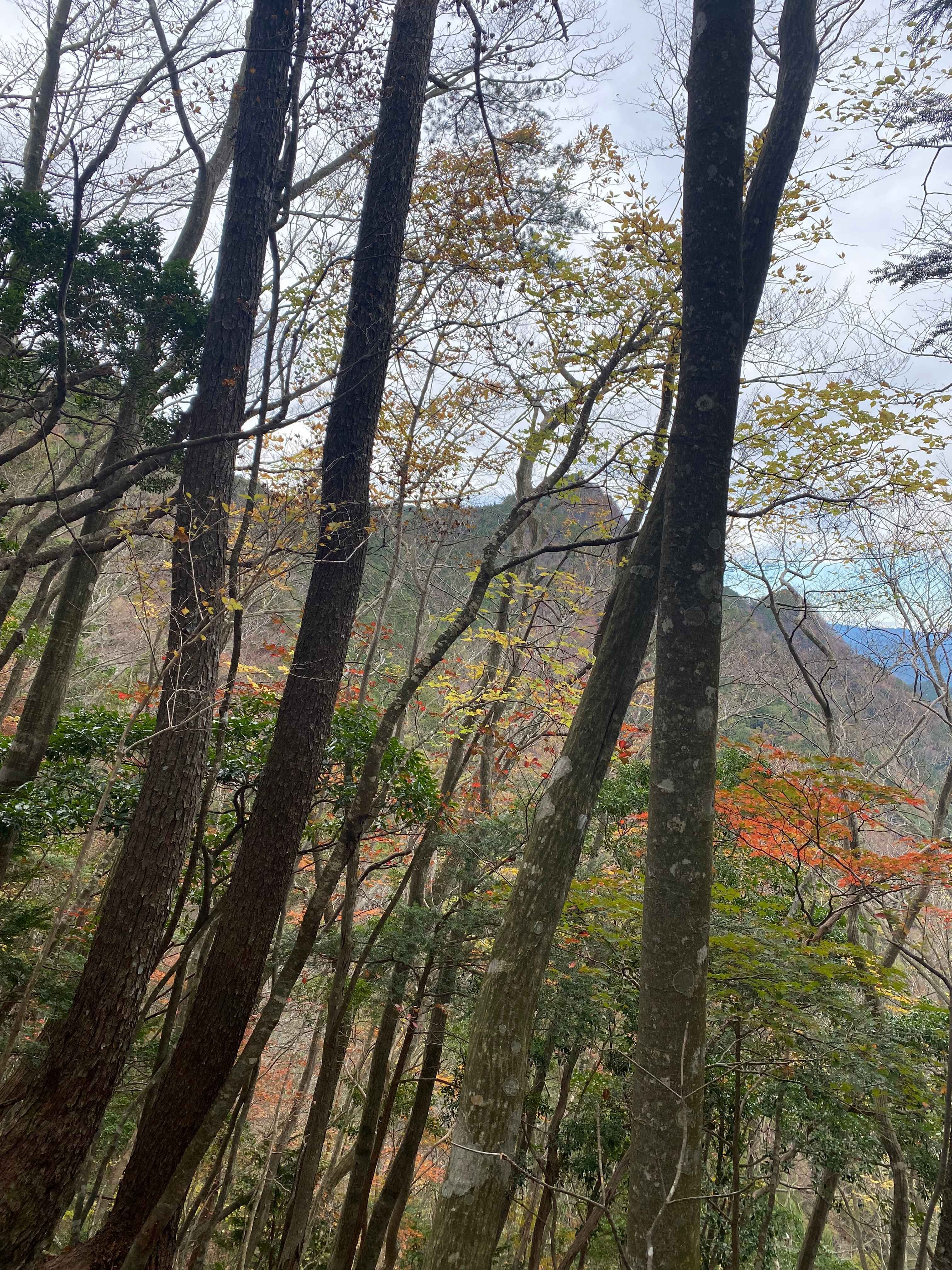 ずっと樹林帯を下ってきましたが、2合目でやや景色が開けており明神山の雄々しい岩盤を望むことができます。