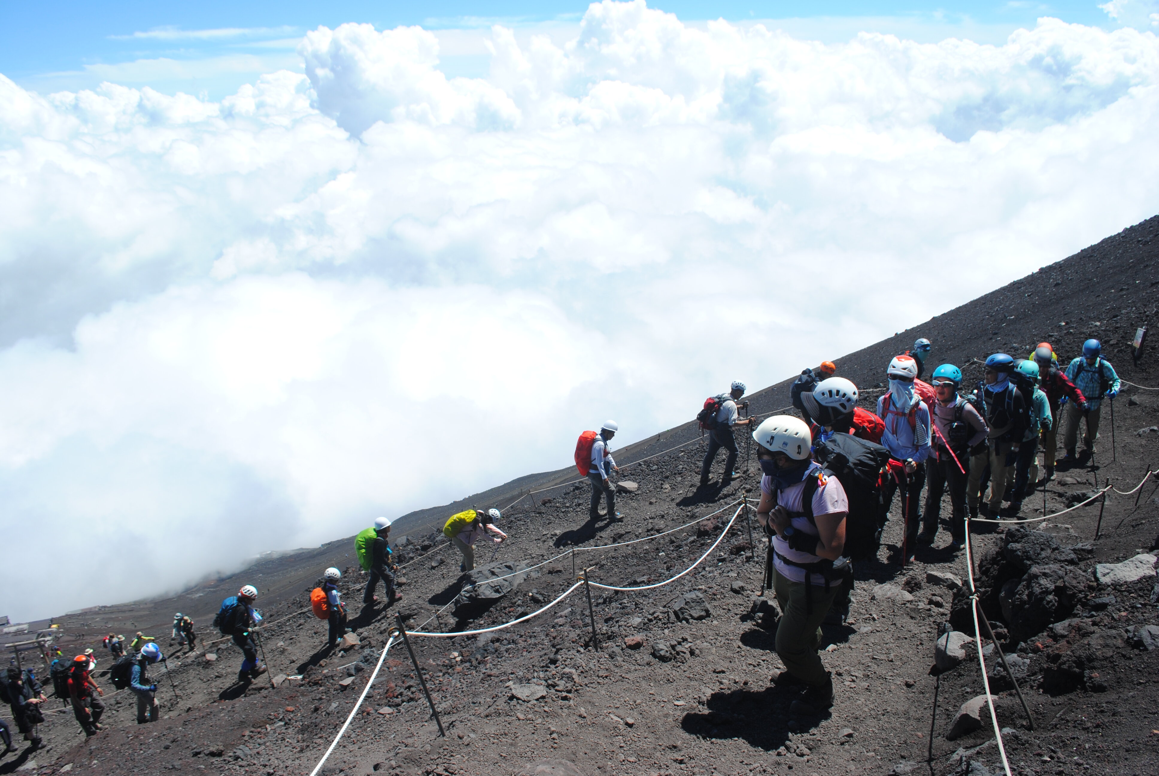 翌10日午前4時40分過ぎに日の出館を出立した。山頂への道は険しい。7~9合目にかけては、荒々しい岩場を通過することになる。かつて溶岩流だった岩は冷えて固まり、人間の皮膚を切り裂きそうな突起もある。