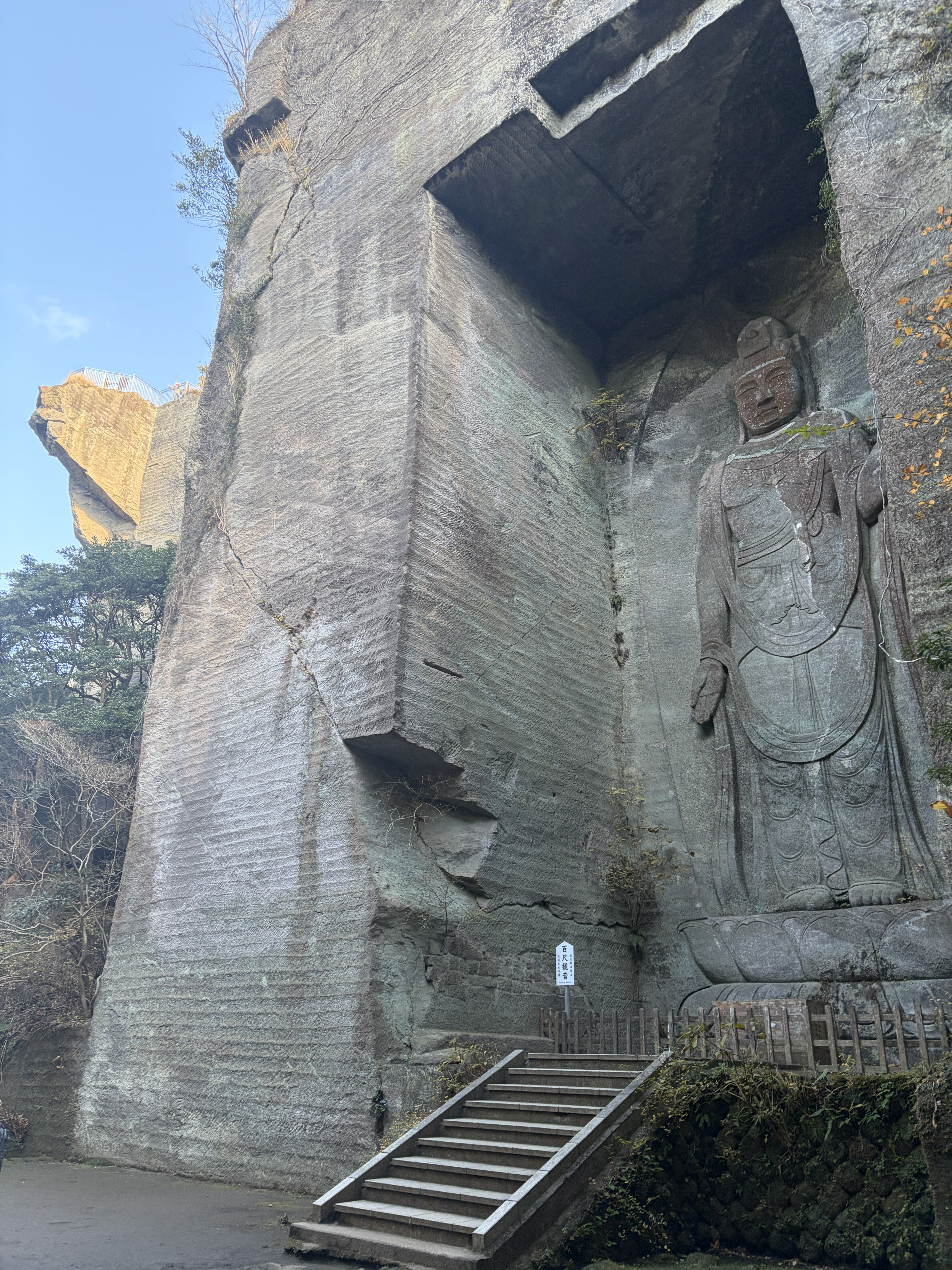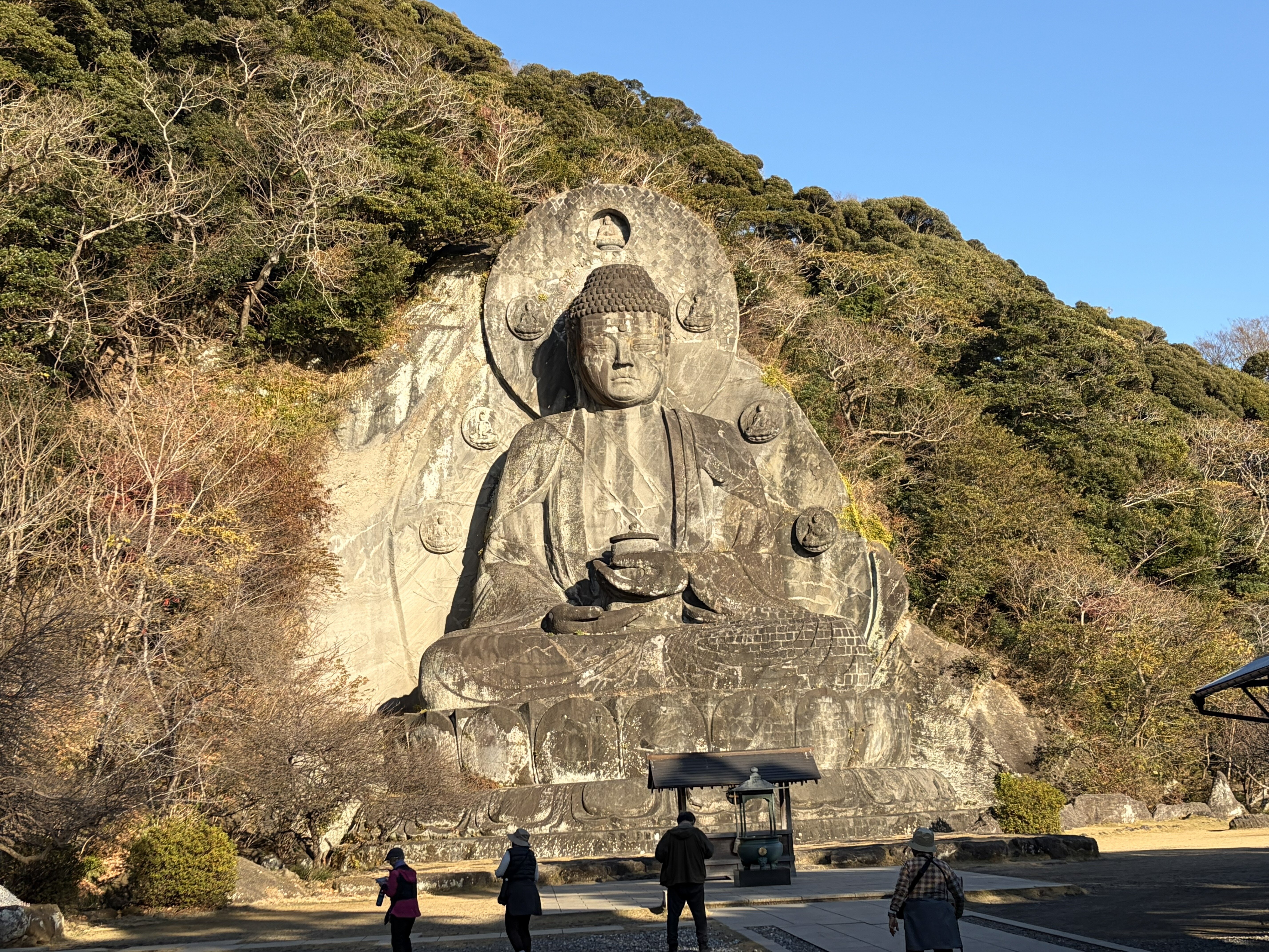翌日は鋸山へ。関東百名山にも選ばれていて、千葉県を代表する人気の山です。今回の参加者は、既に登頂されている方が多く想定されていましたので、いくつかの登山ルートがある中、今回はロープウェーを選択しました(笑)。山頂からの眺望は素晴らしく、東京湾を中心に眺望を満喫。下りは百射観音や聖徳太子像を眺め33mの大仏へと歩きました。