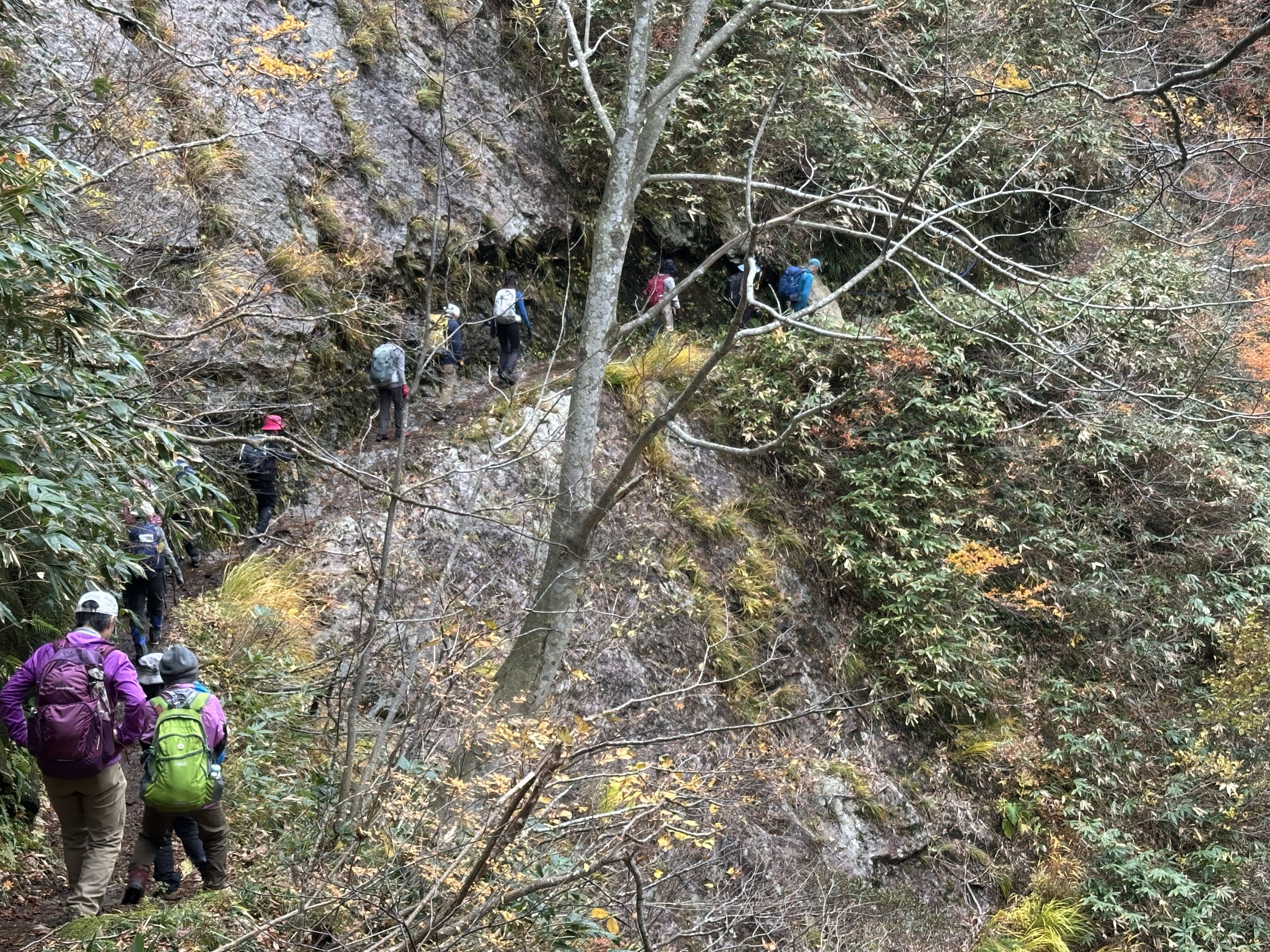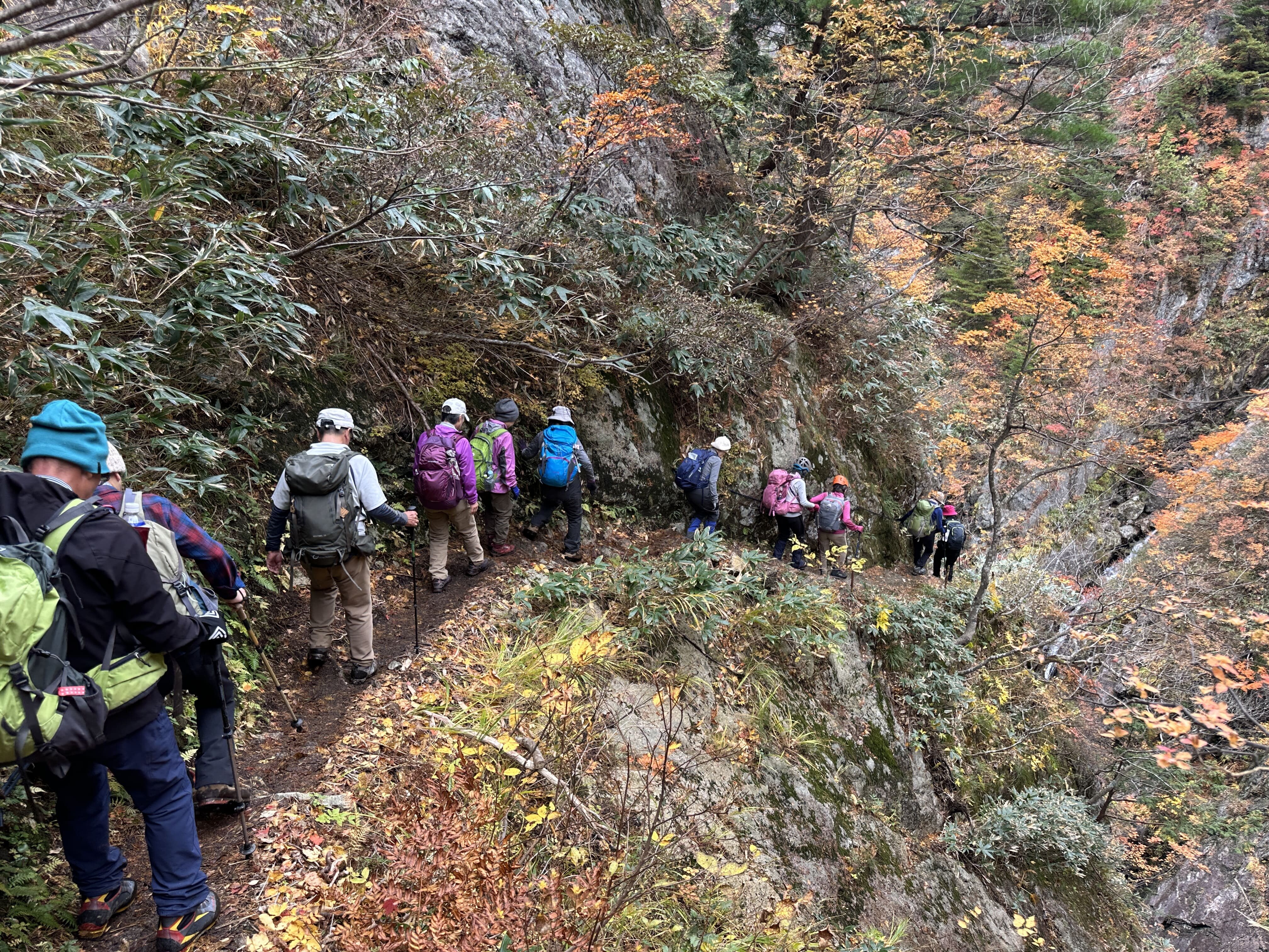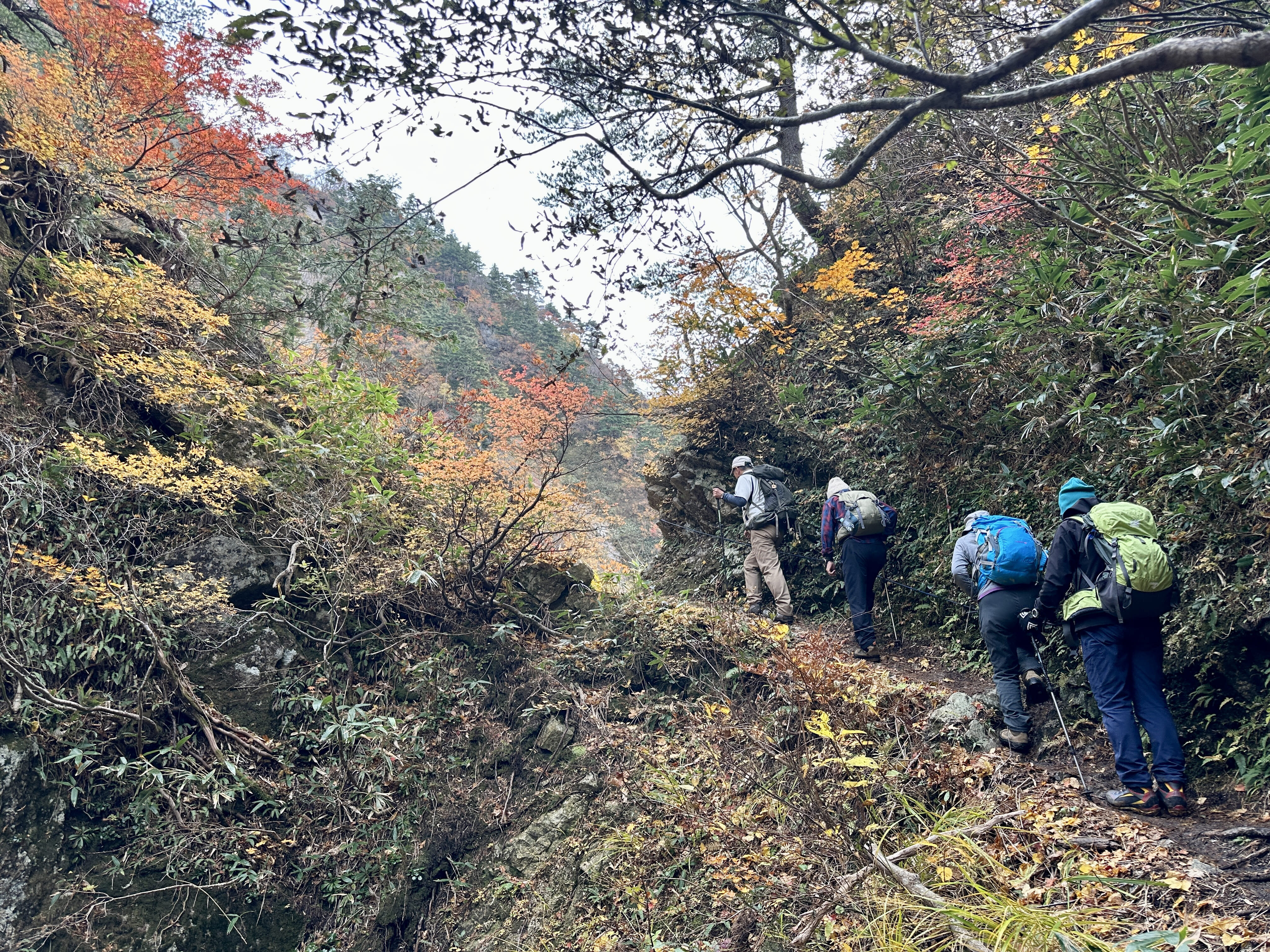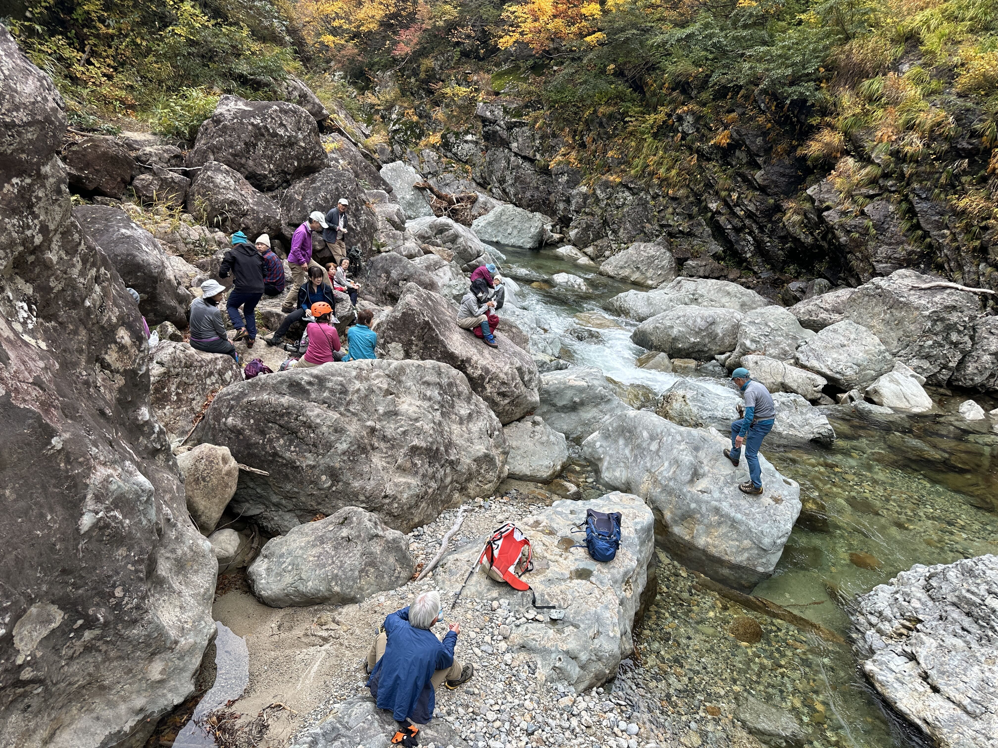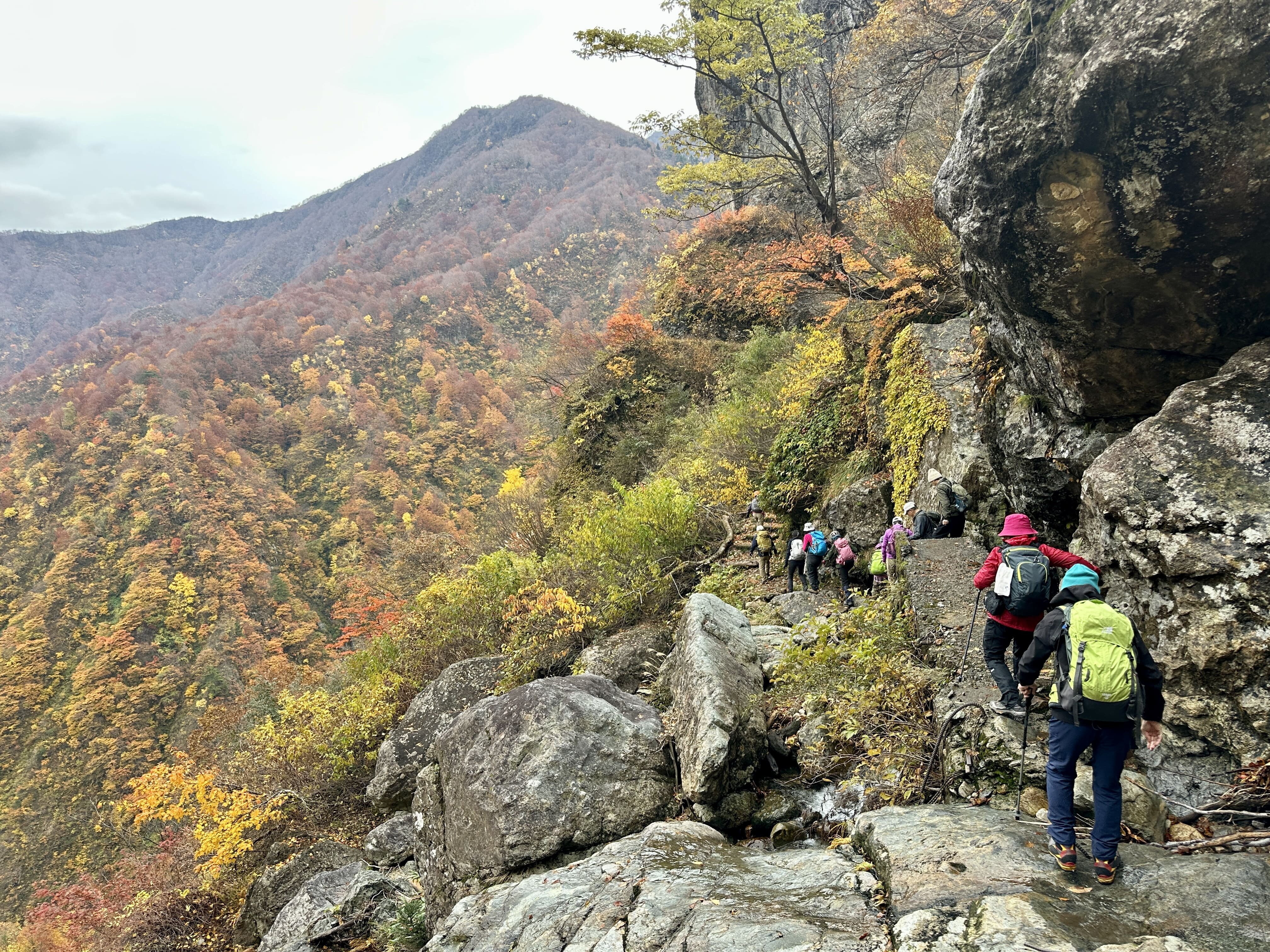登山口は標高約630m、今日は雲が優勢ですがエメラルドグリーンに輝く渓谷の美しさと素晴らしい紅葉に皆さん思い思いに写真を撮ることができました。