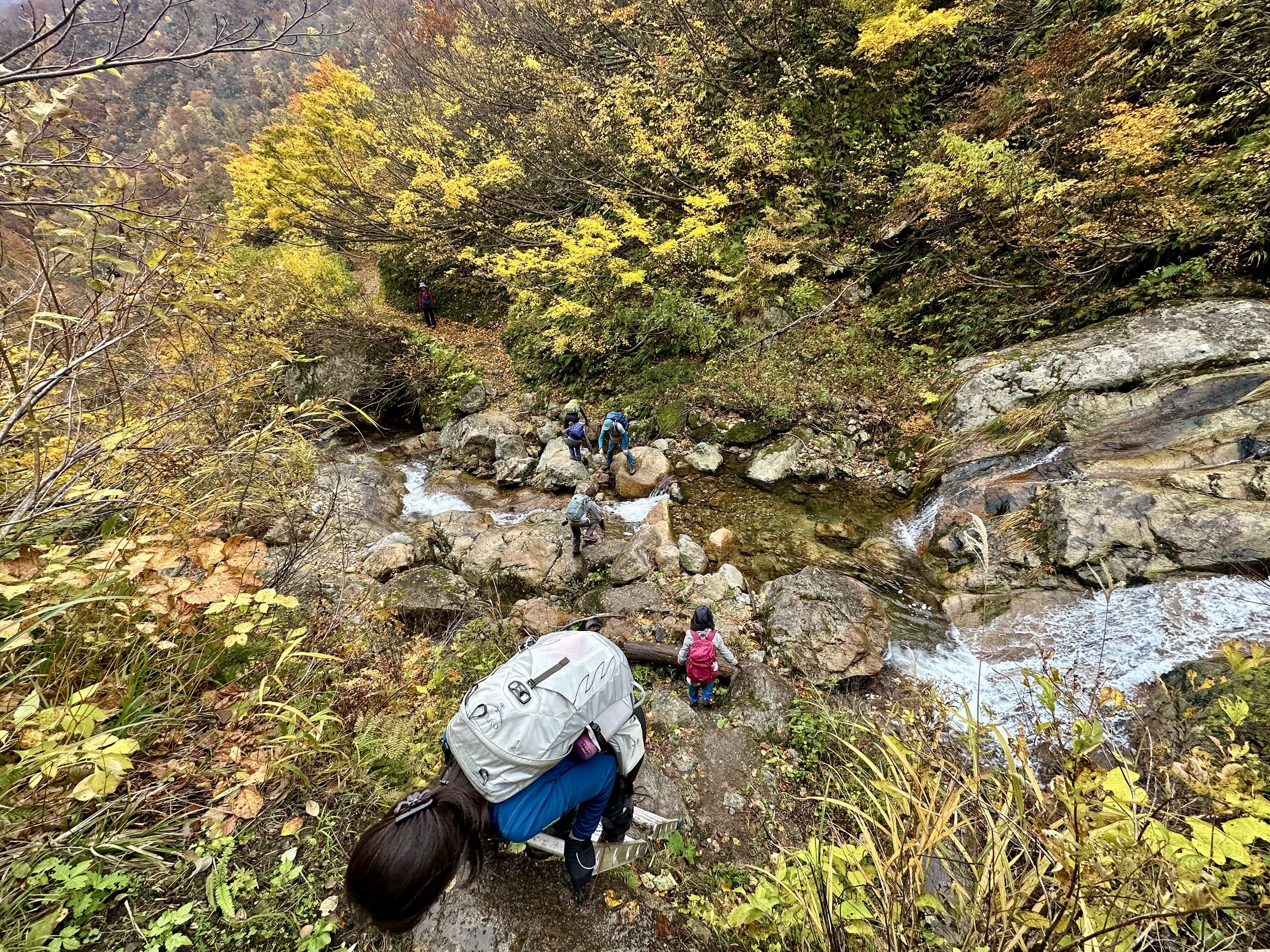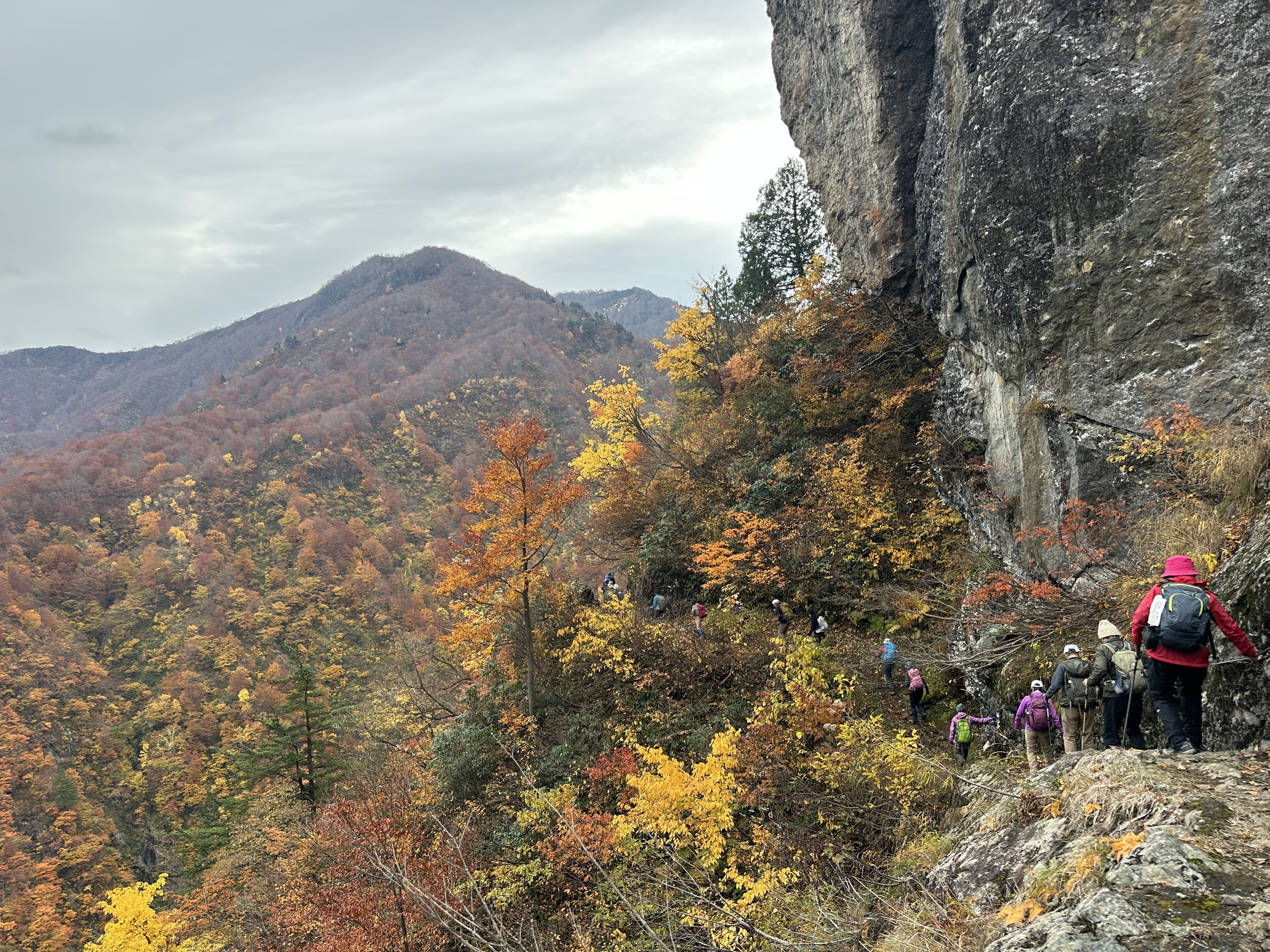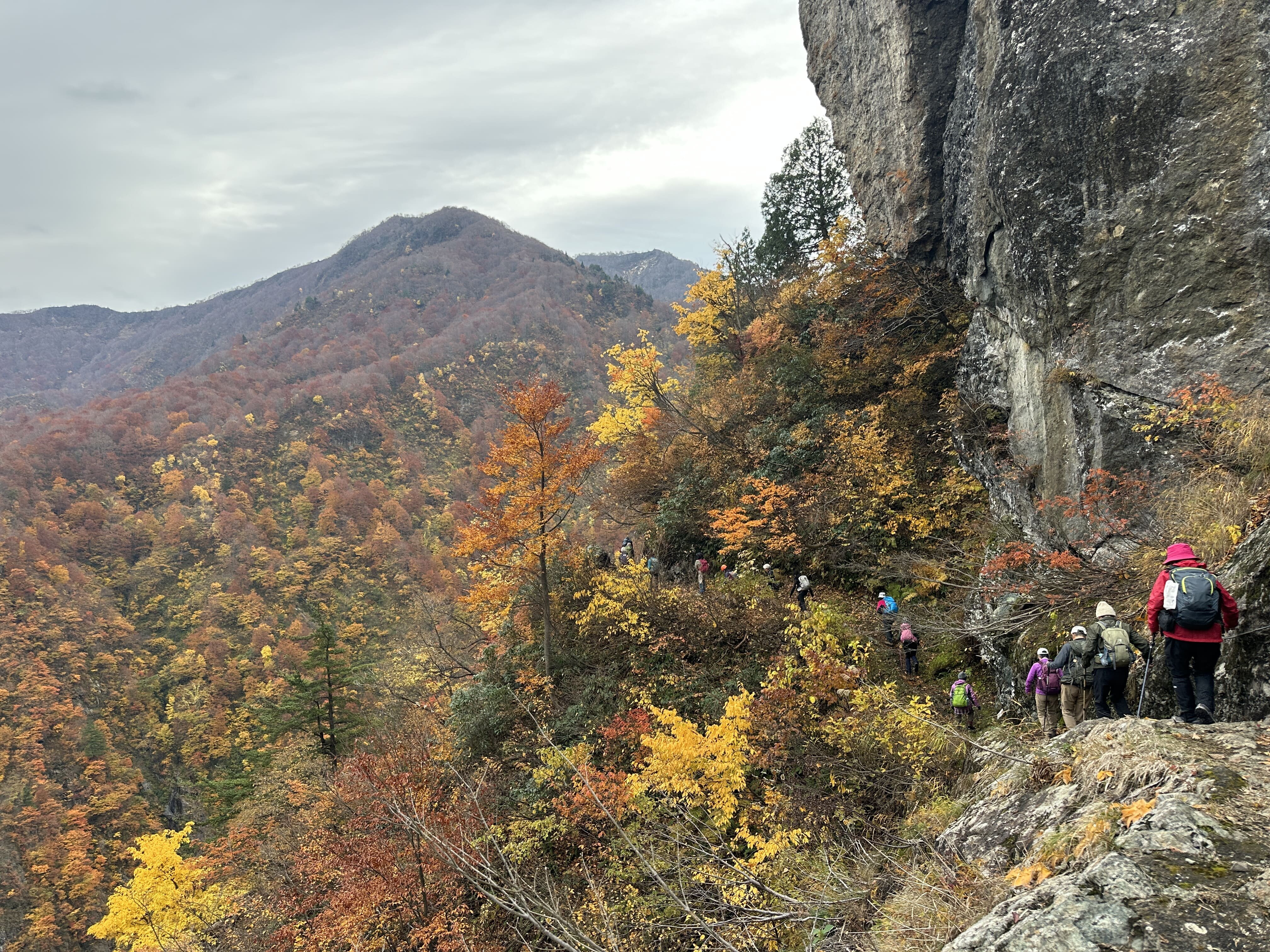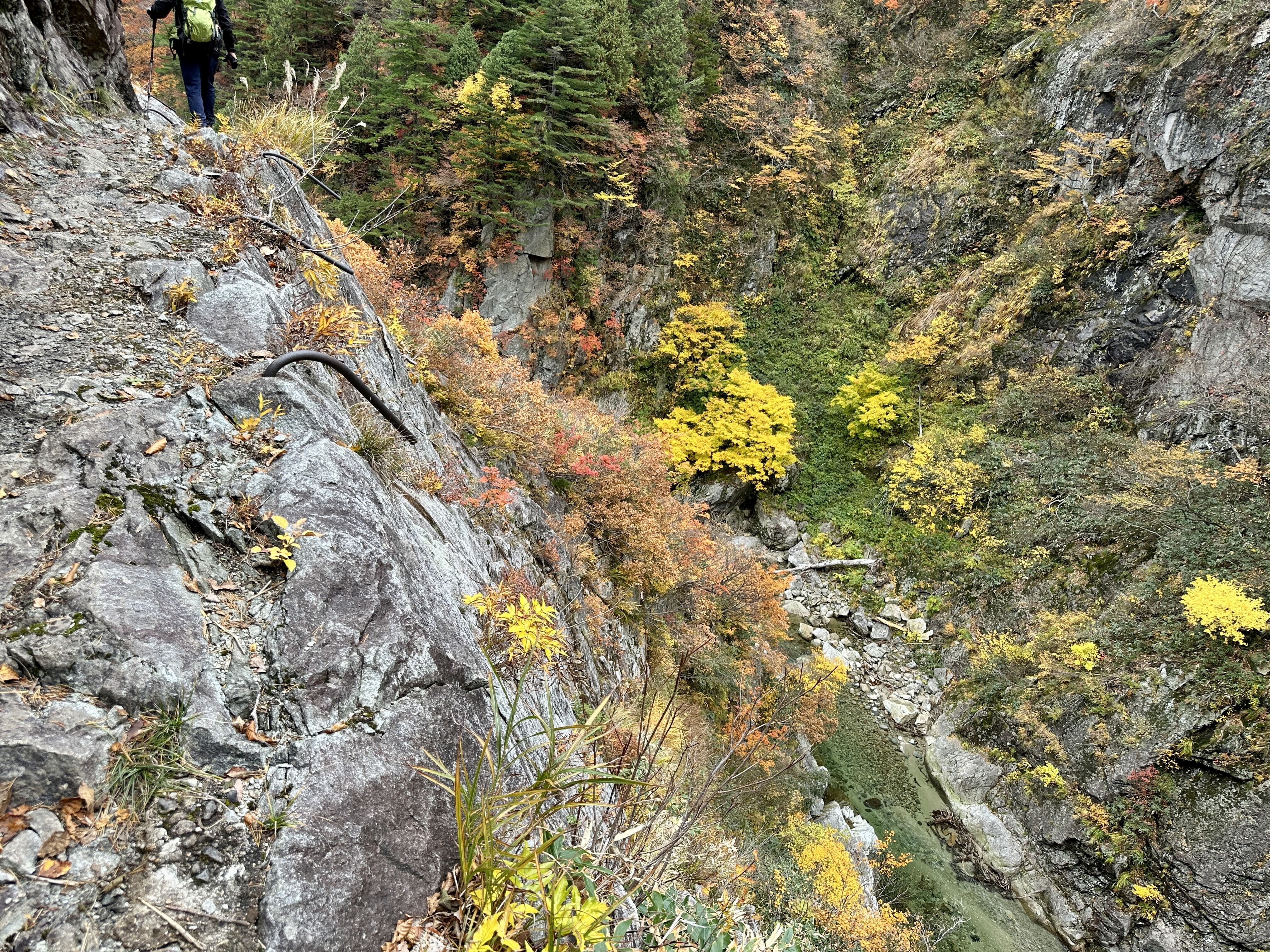 登山口は標高約630m、今日は雲が優勢ですがエメラルドグリーンに輝く渓谷の美しさと素晴らしい紅葉に皆さん思い思いに写真を撮ることができました。