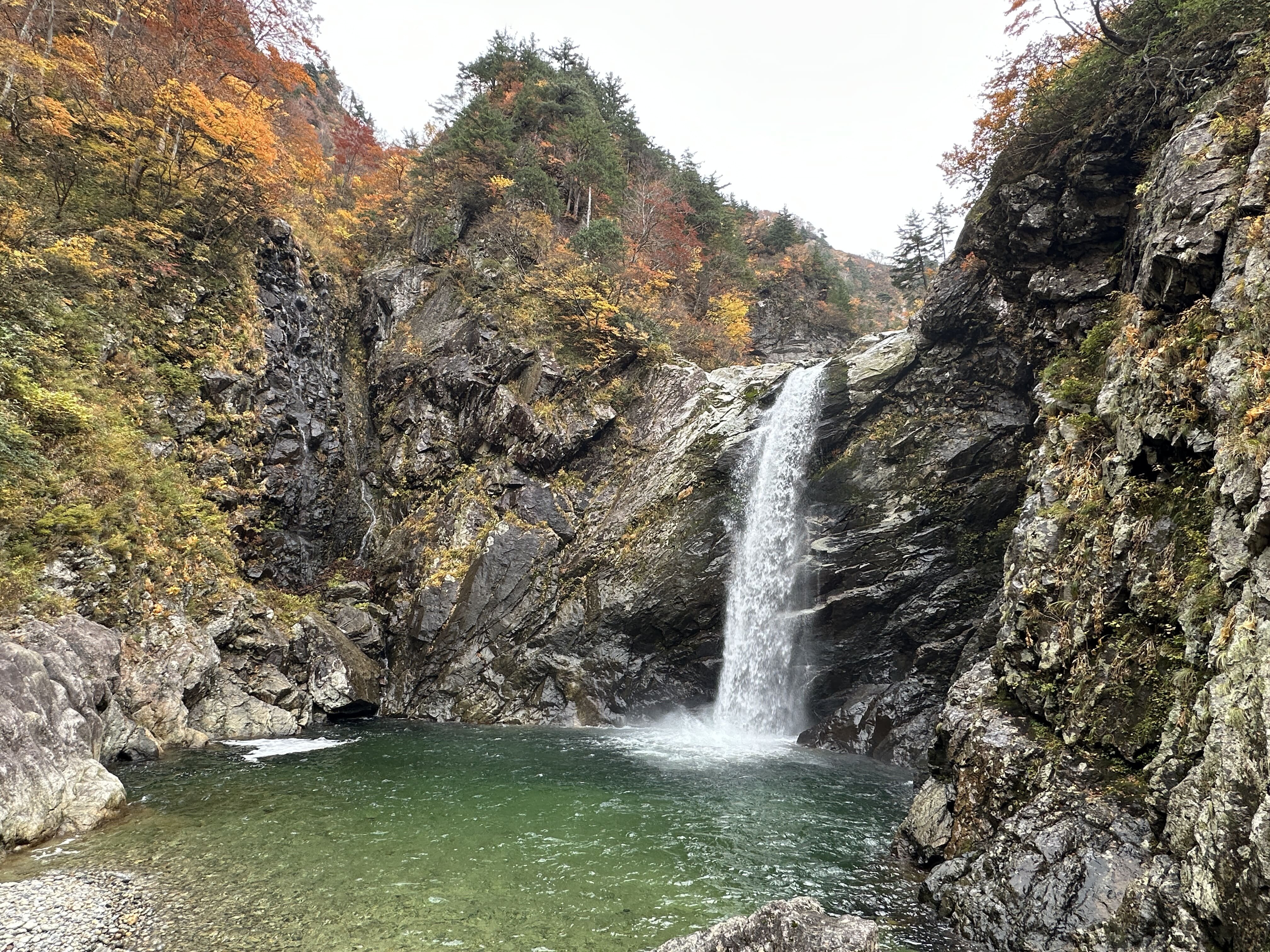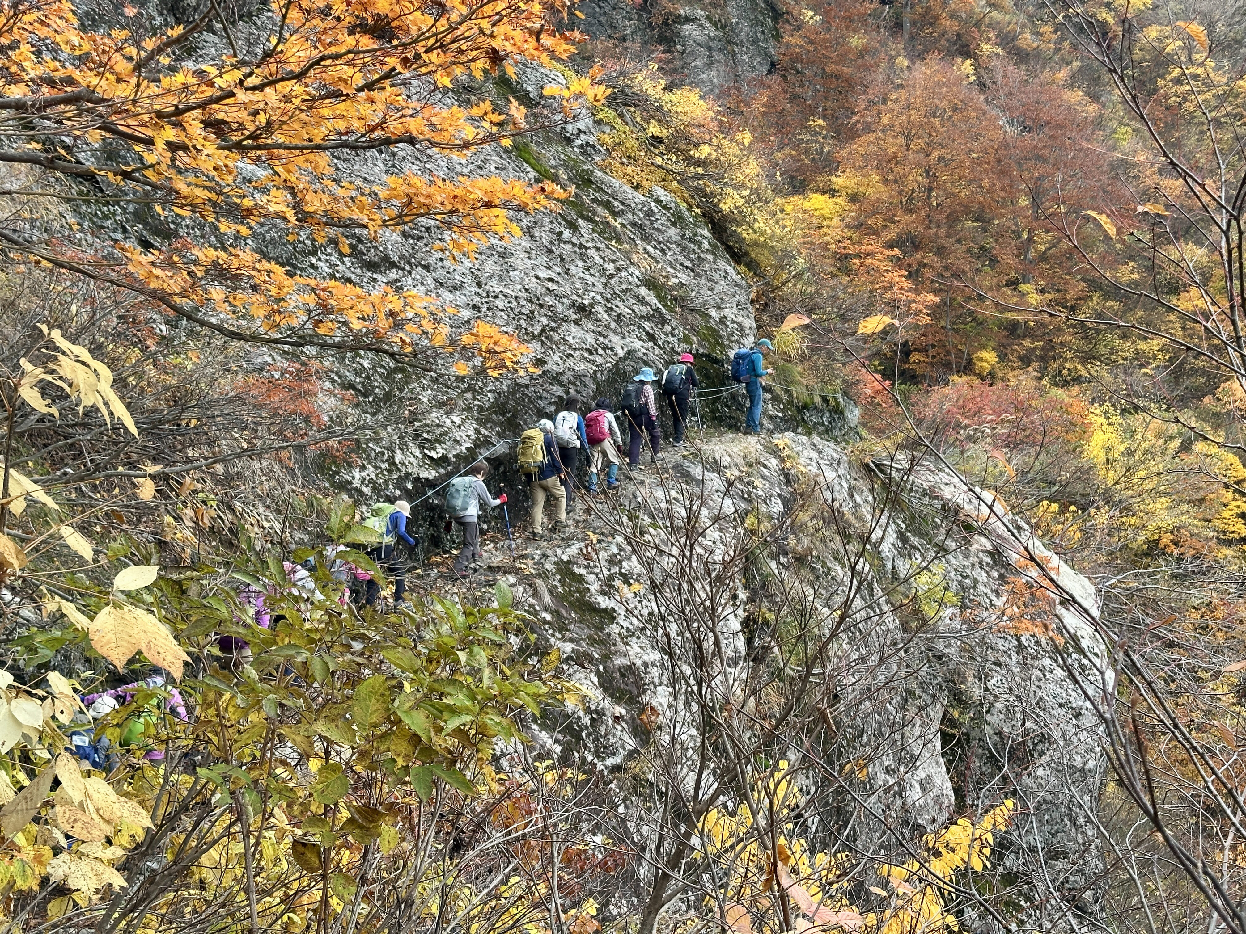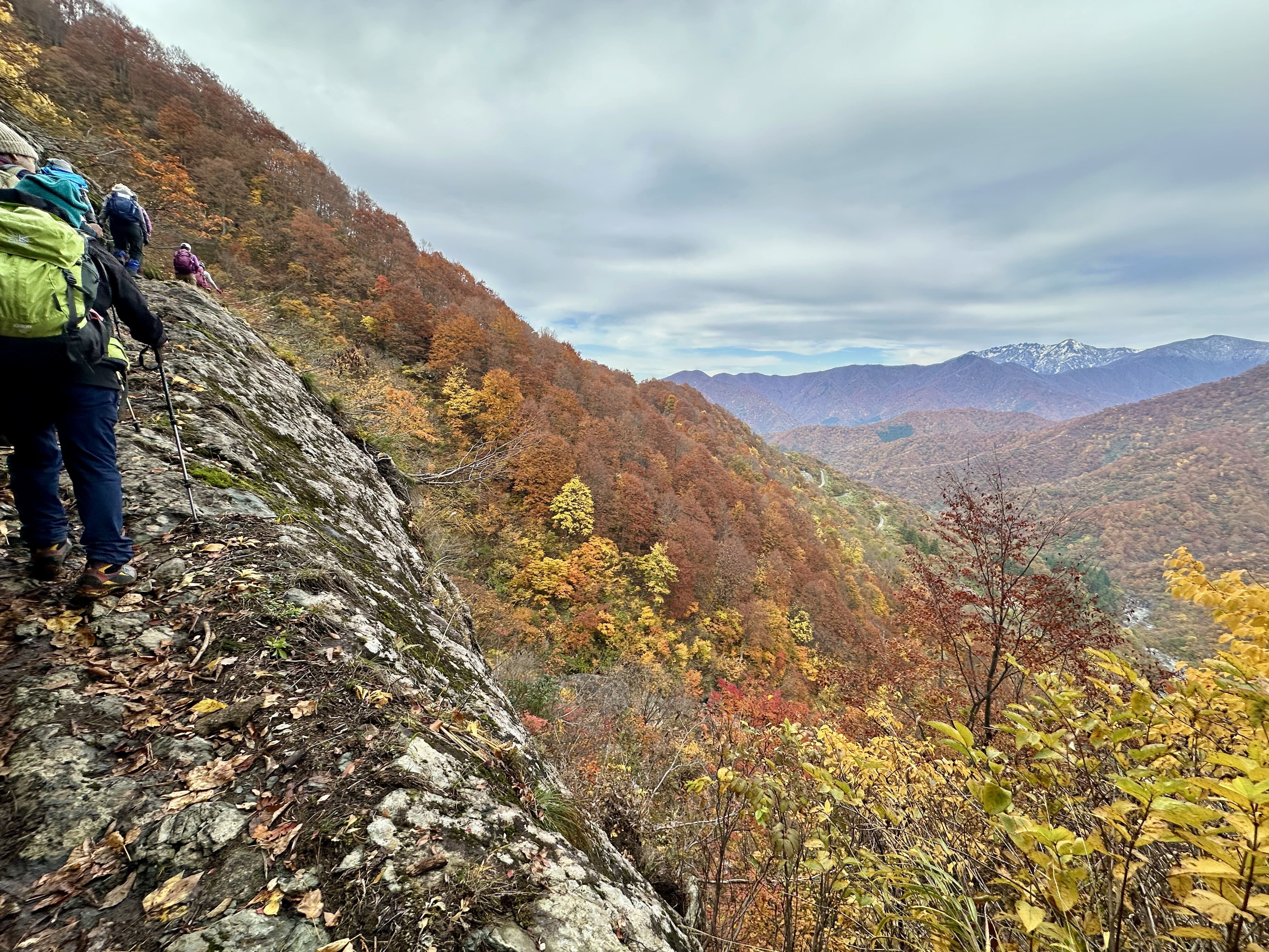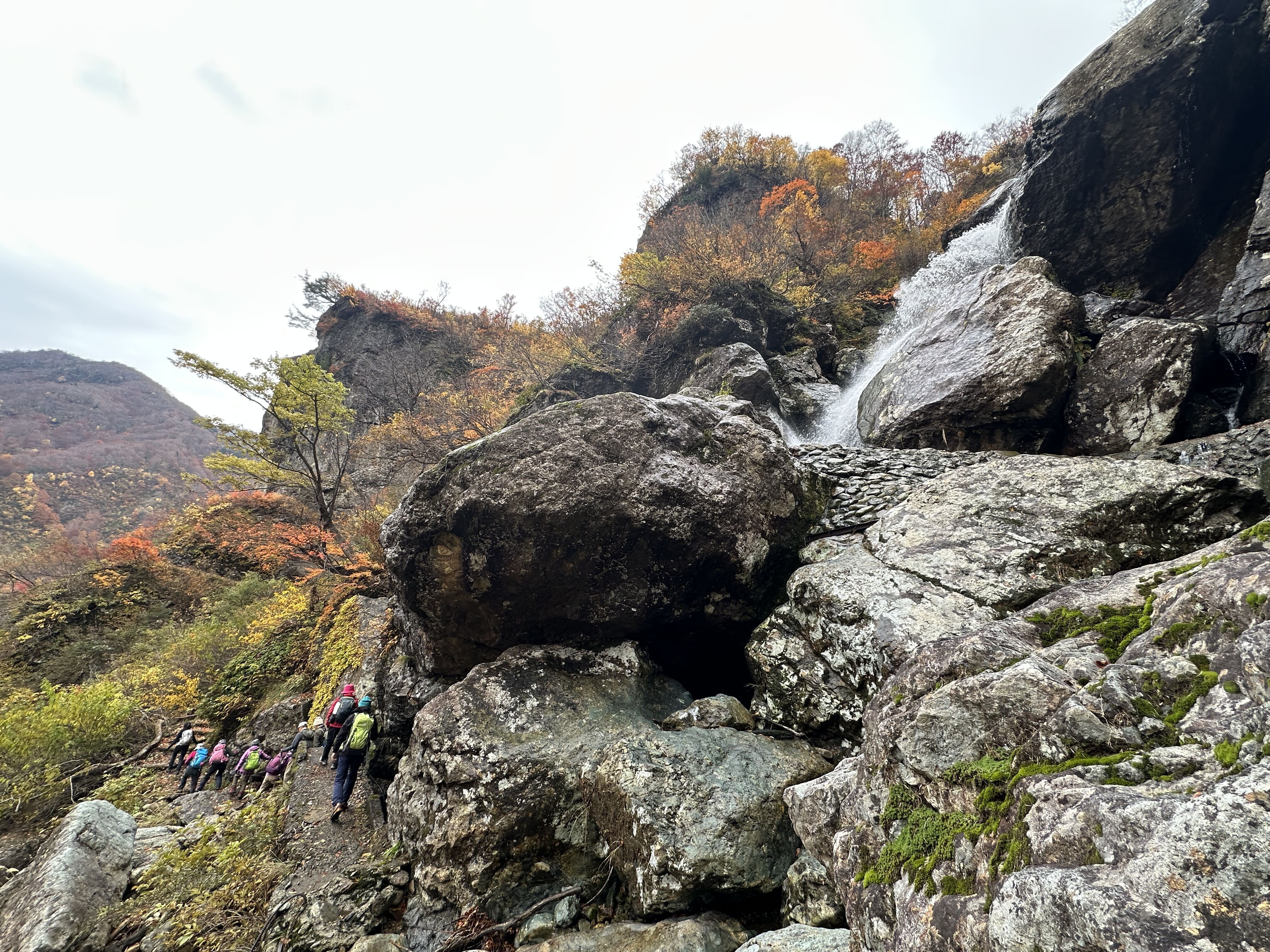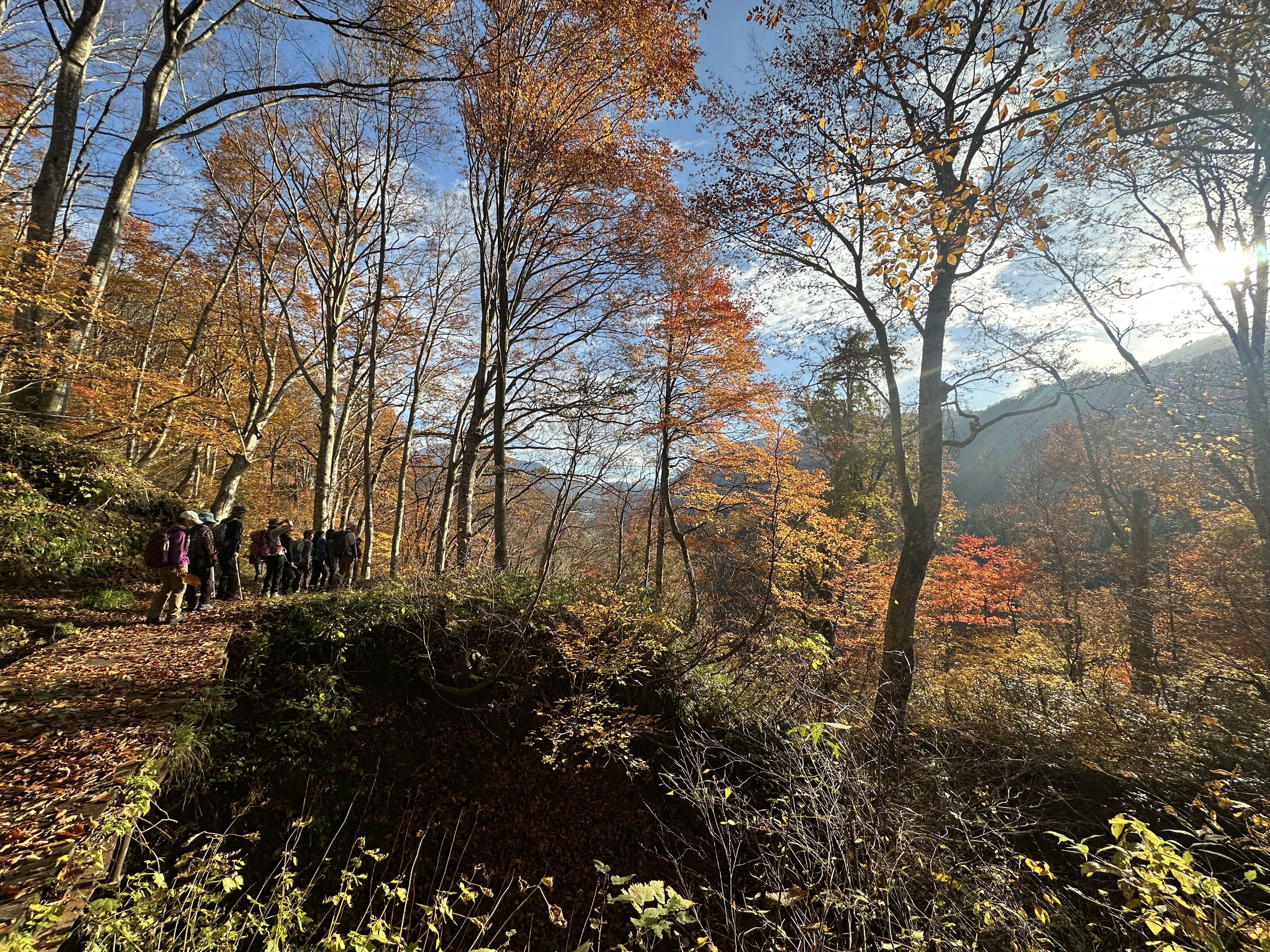登山口は標高約630m、今日は雲が優勢ですがエメラルドグリーンに輝く渓谷の美しさと素晴らしい紅葉に皆さん思い思いに写真を撮ることができました。