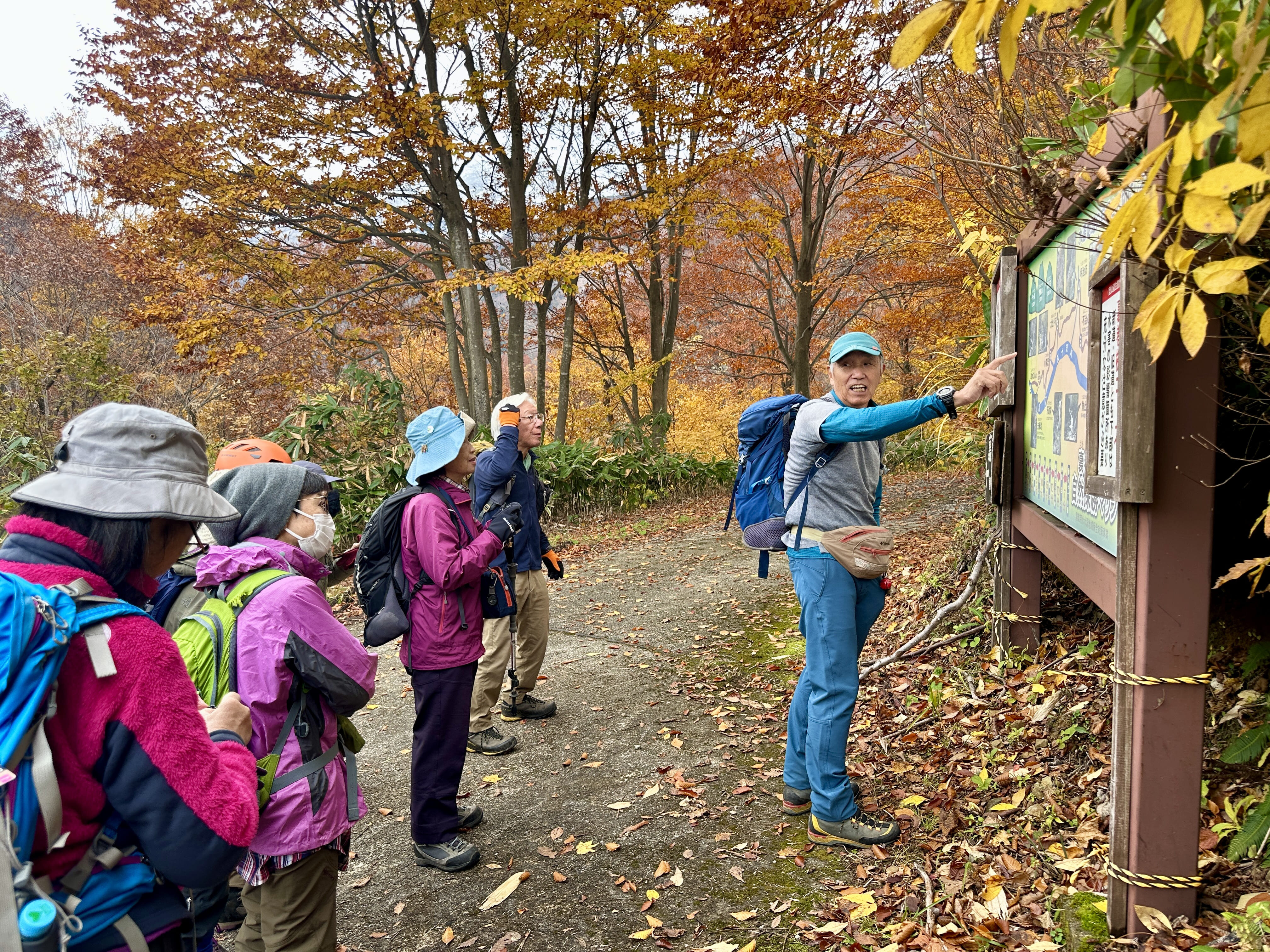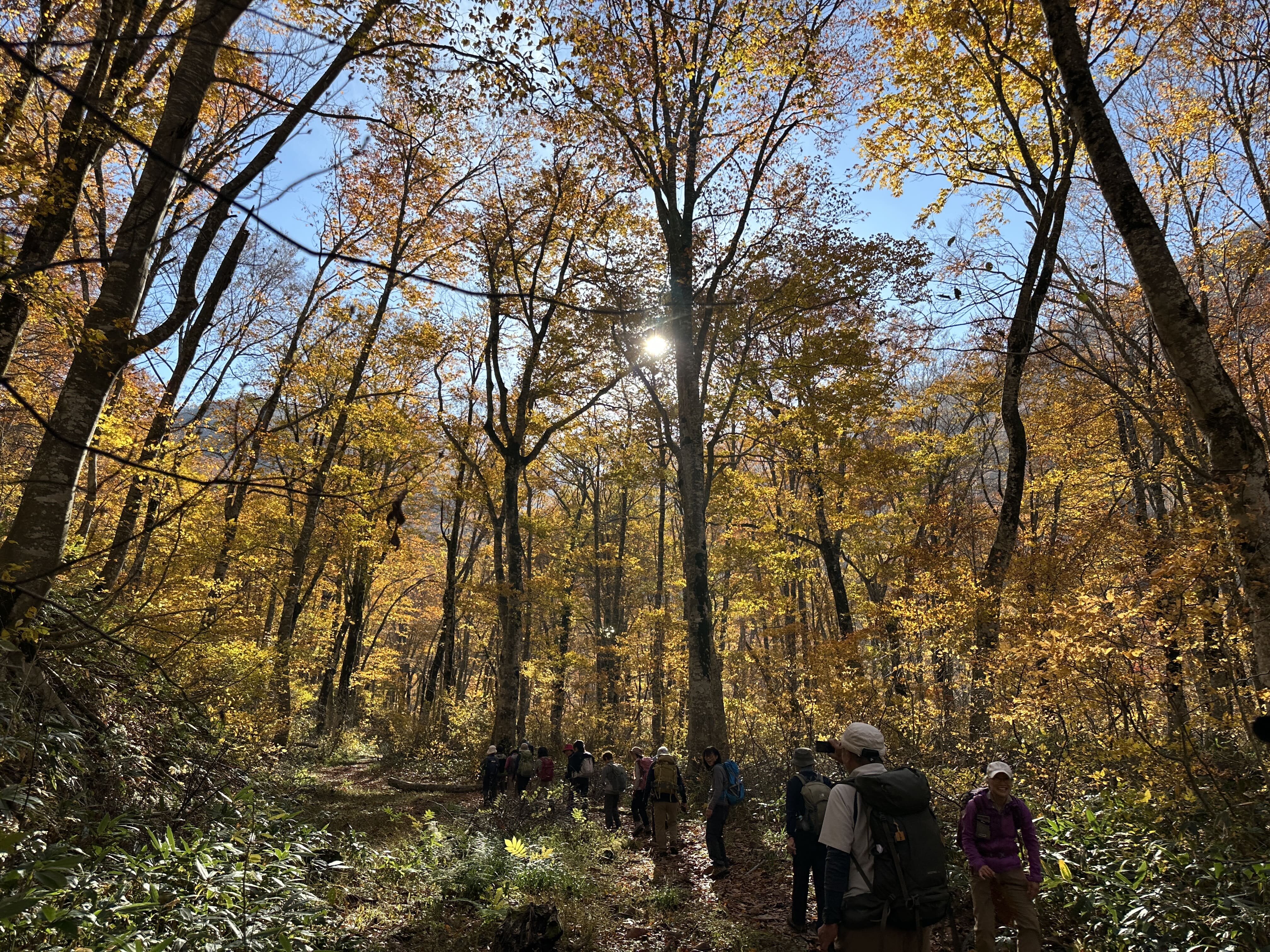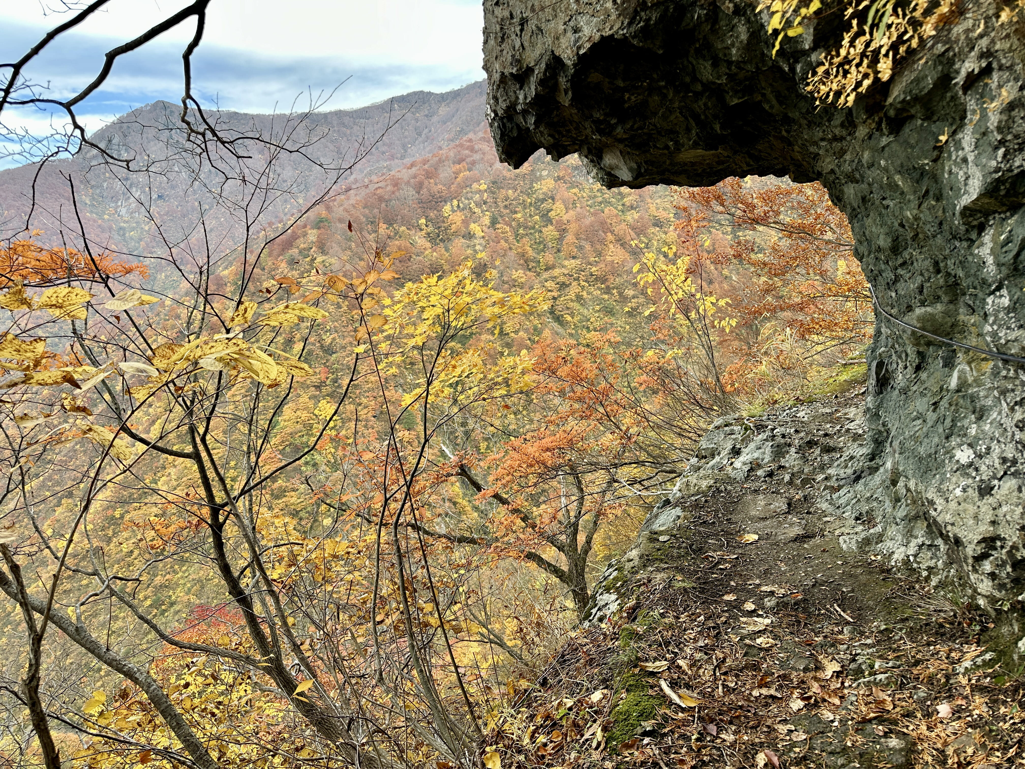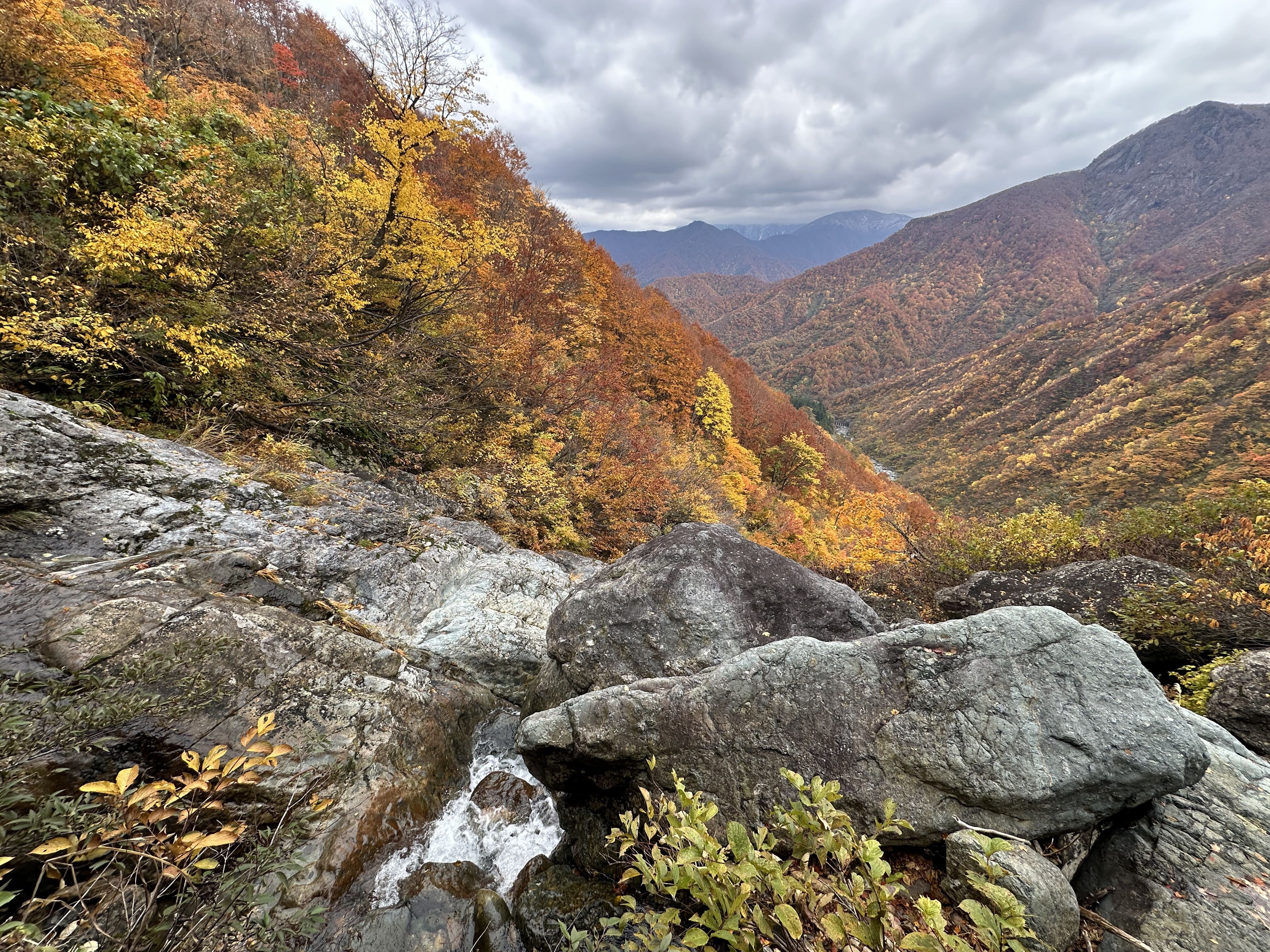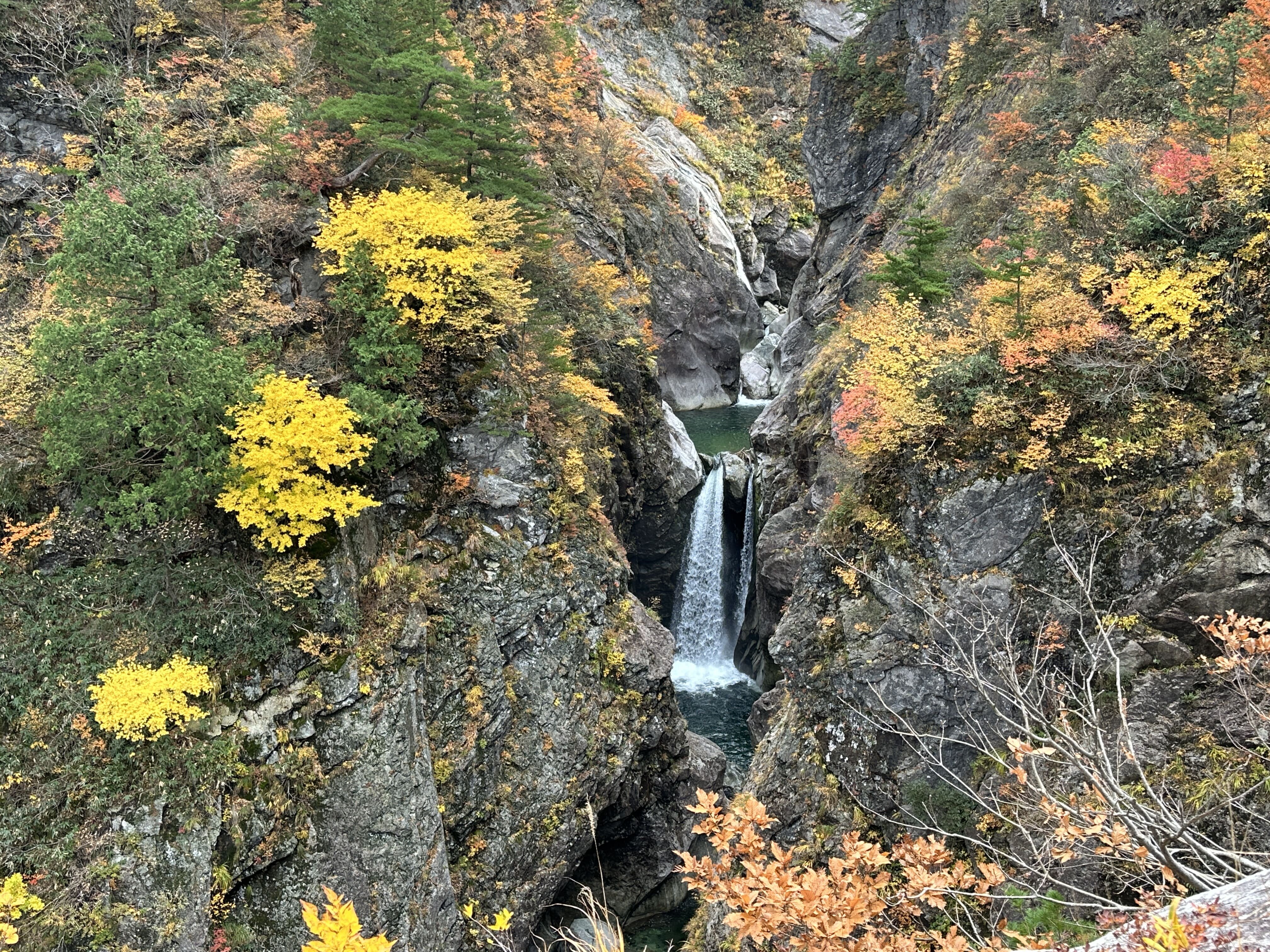 登山口は標高約630m、今日は雲が優勢ですがエメラルドグリーンに輝く渓谷の美しさと素晴らしい紅葉に皆さん思い思いに写真を撮ることができました。