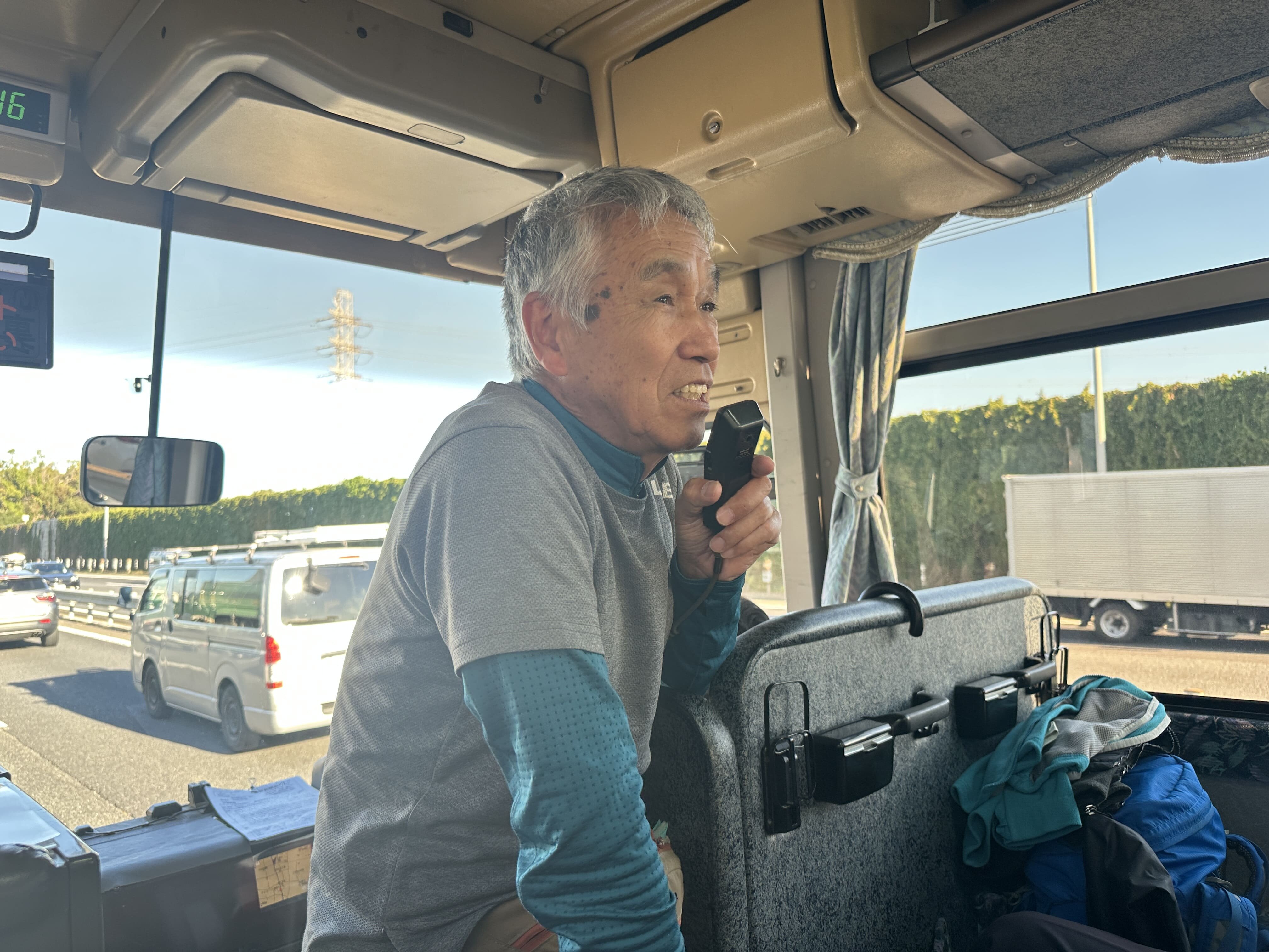 青空のもと走り出したバス車内では、小室ガイドが車窓から見える山の話で皆さんを楽しませてくれます。